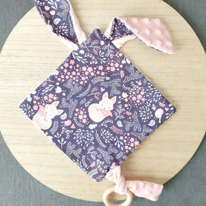 Il y a une languette en minky tout doux sur laquelle est noué un anneau en bois naturel prévu pour bébé. La languette permettra d'y nouer la tétine afin de retrouver + facilement l'un est l'autre.